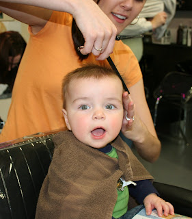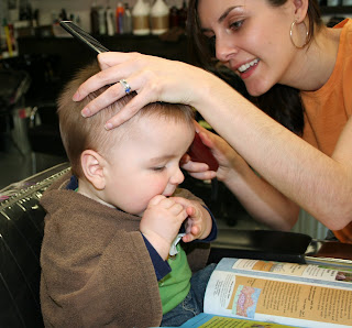 Mom and Grandma took Mr. Liam down to The Shop in Juanita Village for his first haircut today. It took 30 minutes and cost $5.00. The woman had to cut his hair in 5 second intervals because Liam was very curious as to what was going on. He read (ok, chewed on) his magazine and smiled at Grandma. He sat in the chair all by himself. No more long stragglers!