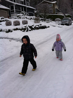 After a beautiful week of sunshine, the snow hit just as they predicted (for once the weather guys got it right!). 8-10 inches they said - and that's exactly how much sits on our back deck. I LOVE when it snows! The kids LOVE when it snows. We can never get off our hill and suddenly time slows WAY down. We spent 5 days bundling up the kids and taken them out to sled, build snowmen, and play. Leif left on Monday after building a snow man with the kids in the backyard. He was gone all week which I thought was going to be really hard but as it turned out, we fared ok. We have great friends who pulled through to support the kids and I and our new nanny, Lisa, walked up the hill every day so that I could get a few things done. Although I am looking forward to getting back to "normal life", this has been an exciting little break!