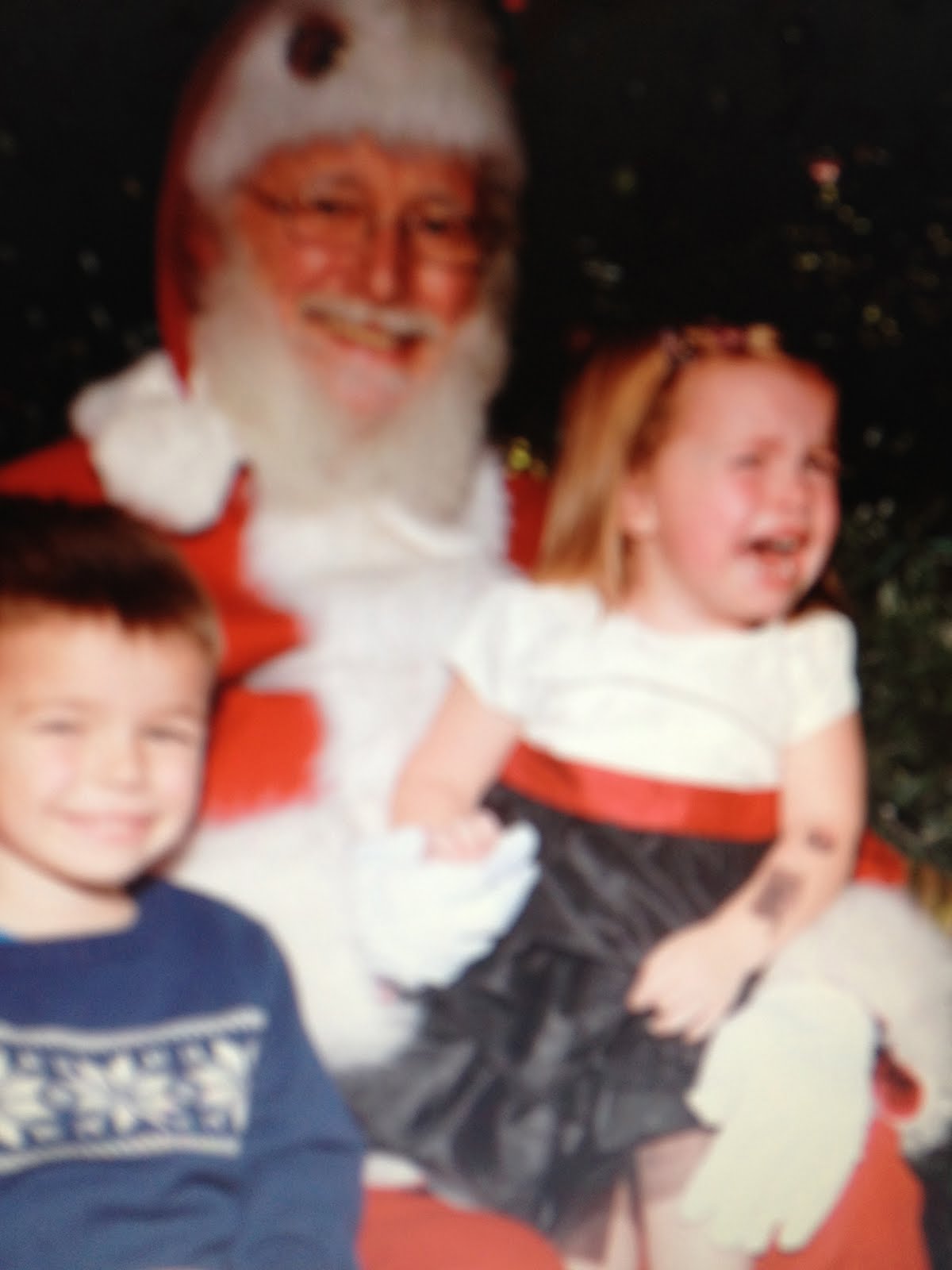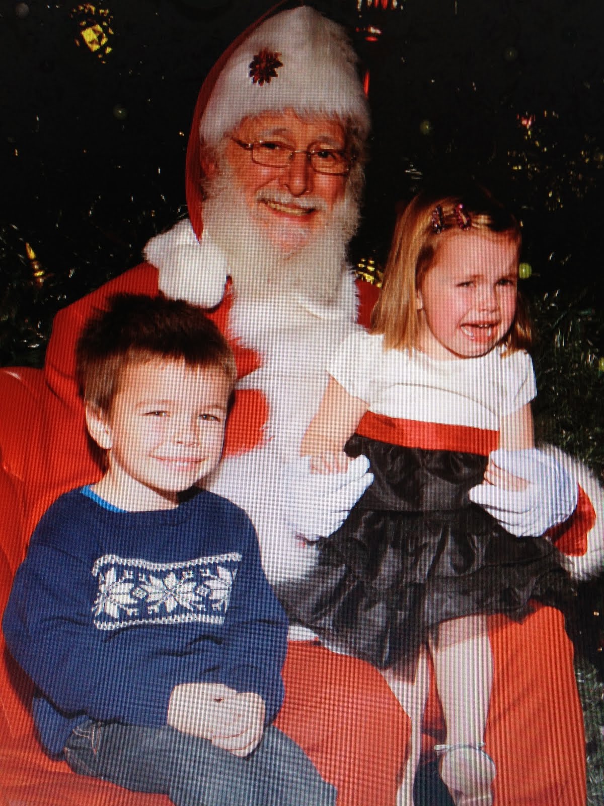 I loved tonight because it so embodies Leif and my style - in raising kids but also with life in general. We decided, relatively last minute, to take the kids (and Grandma) to Bellevue to watch snowflake lane and all its magic. We bundled the kids up because it was freezing and they both looked like little snowmen about to fall over. As we were driving to Bellevue, we started talking about Santa pictures which we had not yet gotten. Leif had heard that there was a 2 hour line most times of the day. But, just in case, we parked on the opposite side of the mall so that we could check out Santa's house on the way to Bellevue Way. Sure enough, there was a concert going on in the mall that had pulled almost everyone away from Santa. The line was only about 15 minutes long and we didn't want to miss our chance. But, Santa pictures in jackets on top of sweatshirts on top of sweatshirt? I don't think so. So, while Leif stood in line and grandma showed the kids all the decorations, I ran down to Gymboree (the kids store) and picked out Santa outfits. We stripped them down right there in Santa's shop and got them in their new and improved outfits just in time for the picture. Skyler wailed but stopped when we told her she could have a lollipop - however, that did not mean she was happy about the whole thing! Liam told Santa he wanted a red piano, a yellow camera transformer, and captain america.