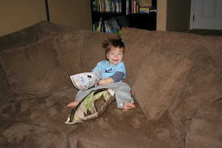 Liam is now 18 months old so we thought it was time to transfer him to his big boy bed. He spent his first night there last night. I read him books until he got sleepy and he only fussed for a few minutes before settling in for the night. I am pretty sure he liked it as he slept almost 13 hours! Leif had to go wake him up by crawling into bed and adjusting with him.
