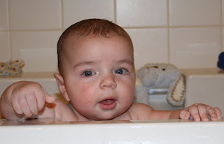 He loves his doctor...thinks his accent is very funny. Liam couldn't get enough of him...the big show off. All smiles, rolling over, so proud of himself. And then that darn nurse poked him with the first shot and all the fun was over. He screamed like I have never heard him scream....FOR 40 MINUTES!!! For the first 10, I was laughing ("c'mon little buddy...toughen up!"). At 15 minutes I started to cry. By 20 minutes, the doctor was back in the room trying to figure out what was going on. And, by 30 minutes, I was starting to get scared. Finally, the little guy calmed down and went to sleep. He woke up cranky but by the next morning, was just fine. Back to his usual happy self! I really think I am more scarred by the experience than Liam is. I am making Leif take him to his 6 month appointment!